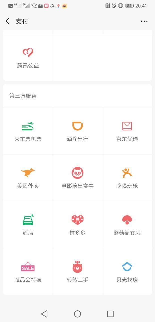 而且,你打開微信支付就能看到,在“第三方服務”的十二宮格裏,同在電商領域爭食的,就有京東、拚多多、唯品會、蘑菇街4家。“馬爸爸”領養的孩子實在太多了,想給誰喂點獨食照顧一下並不容易。
