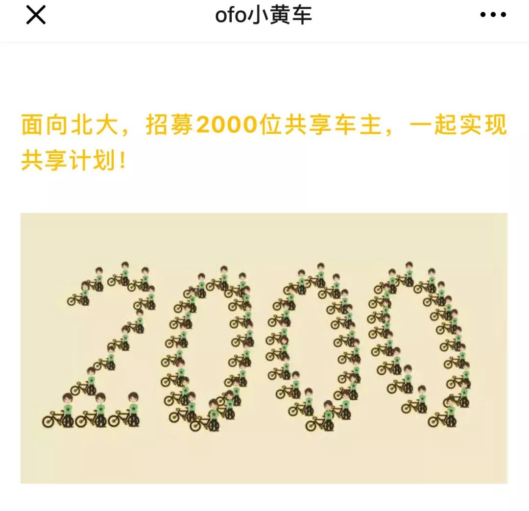 由ofo聯合創始人張巳丁執筆的《我們有一個夢想:讓北大同學隨時隨地有車騎》公開信中,描繪了小黃車初始的理念:“在北大招募2000名勇士,把自行車共享出來,這2000個人就共同擁有了2000輛車的免費使用權,其他同學要用需要付費。”文章還特別表明,“這也是單車市場的分享經濟和分時租賃兩大流派的根本差異。”