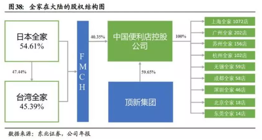 2004年,全家正式進入國內市場,而背後實際控製公司則是中國便利店控股公司,其中頂新集團占股59.65%,台灣全家占股約18.35%,剩餘股權則由日本全家、伊藤忠商事株式會社、FMCH(FamilyMart China Holding)共同持有。