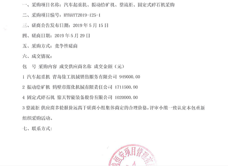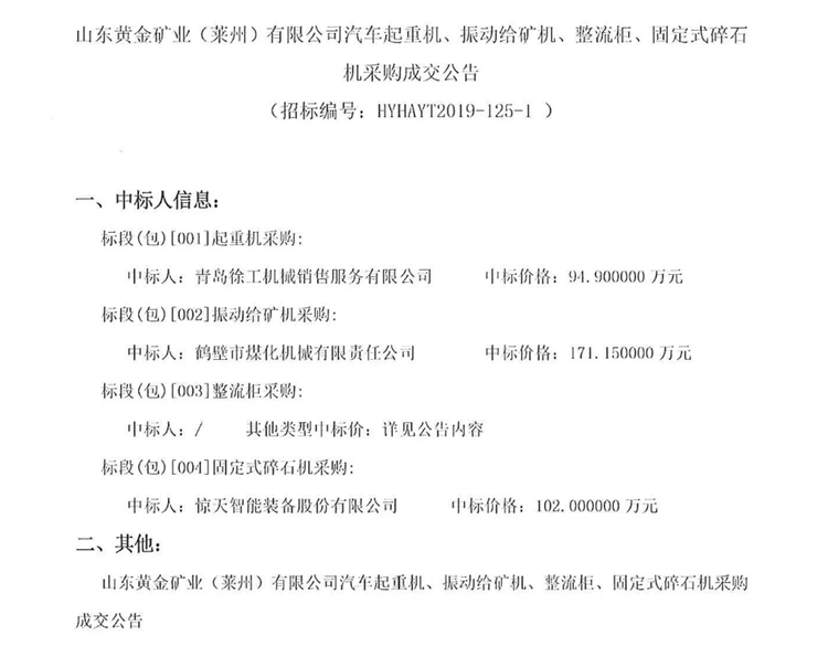 移動版:山東黃金礦業(萊州)有限公司汽車起重機、振動給礦機、整流櫃、固定式碎石機采購成交公告