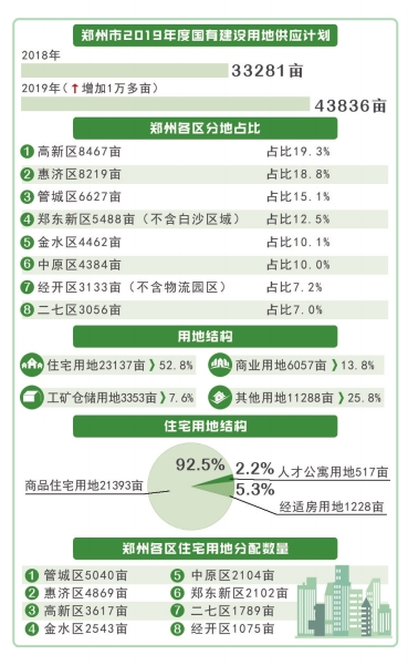 根據《計劃》,2019年鄭州市市本級計劃供應國有建設用地總規模為2922.37公頃(43836畝)。較去年33281畝的總規模增加1萬多畝。