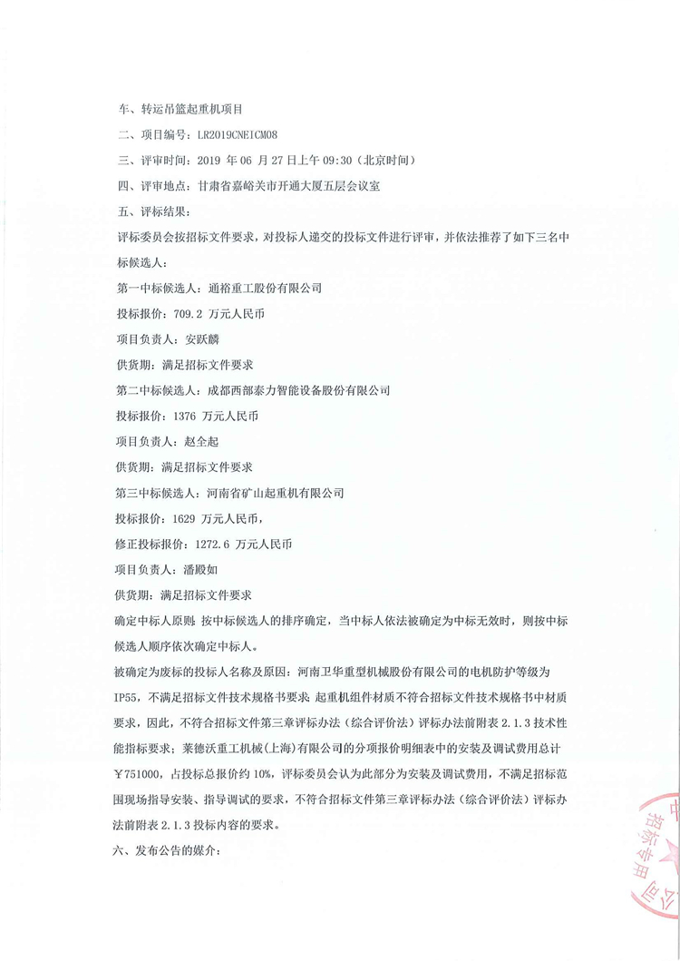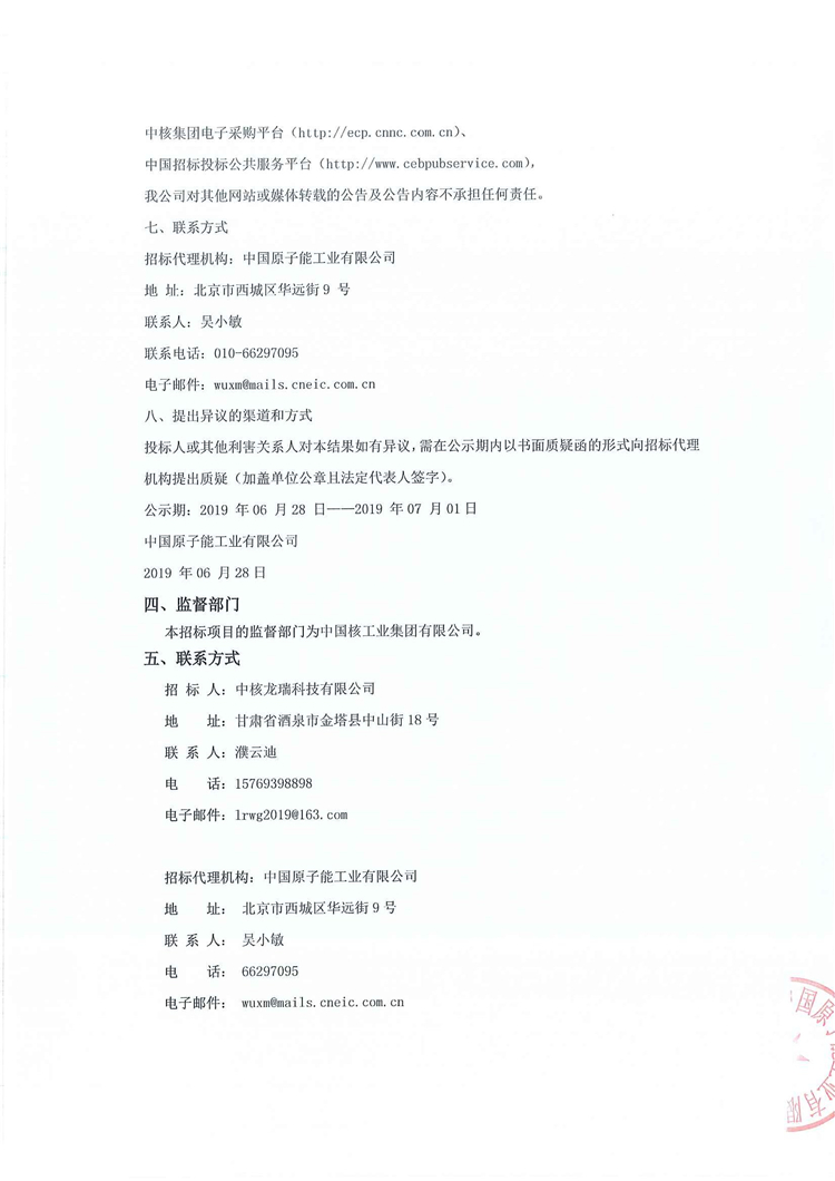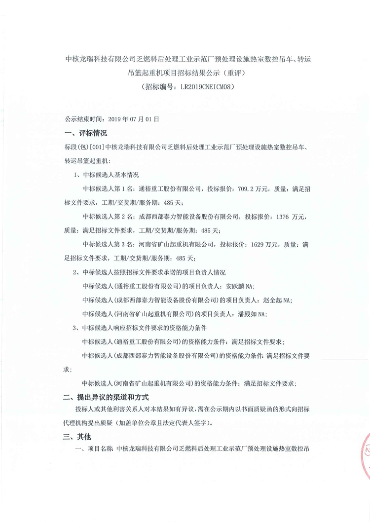 中核龍瑞科技有限公司乏燃料後處理工業示範廠預處理設施熱室數控吊車、轉運吊籃起重機項目招標結果公示(重評)
