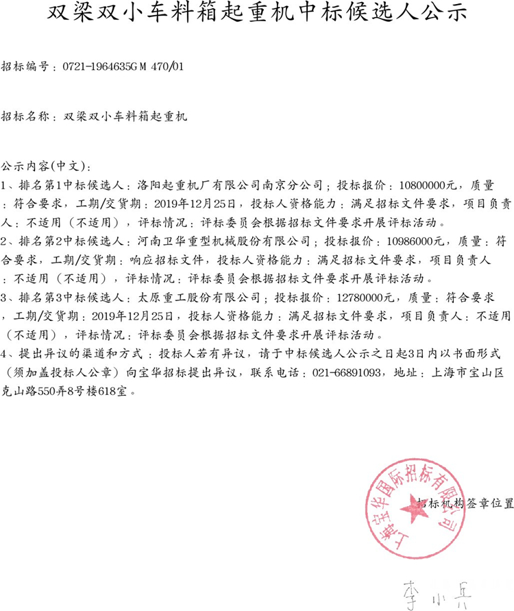 移動版:雙梁雙小車料箱起重機中標候選人公示