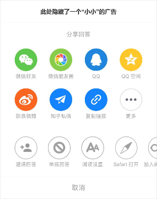 知乎,這個知識問答社區的商業化除了知識付費,還有花式推送的廣告,尤其是這個“更多”彈窗中的廣告: