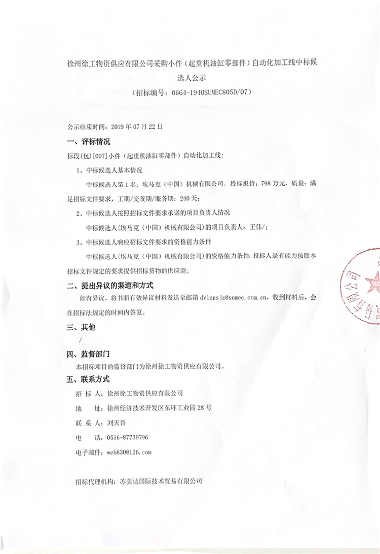 移動版:徐州徐工物資供應有限公司采購小件(起重機油缸零部件)自動化加工線中標候選人公示