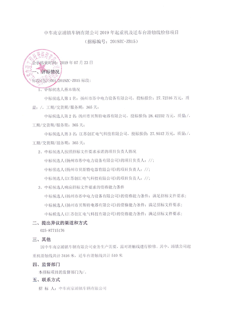 移動版:中車南京浦鎮車輛有限公司2019年起重機及遷車台滑觸線檢修項目中標候選人公示