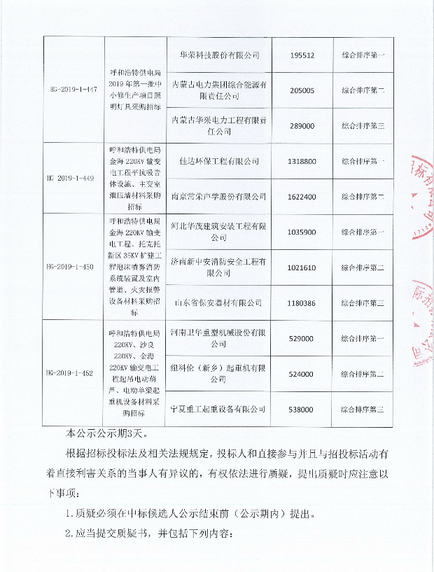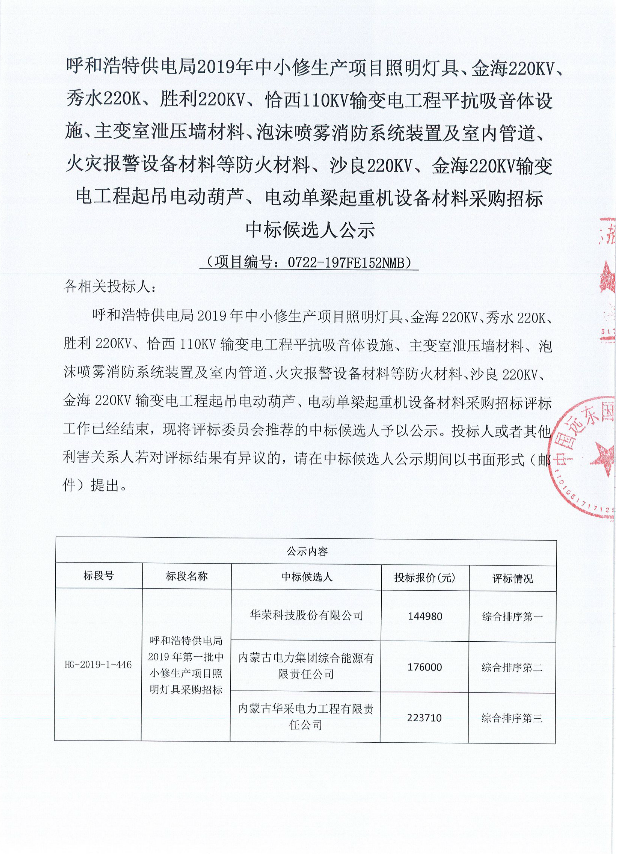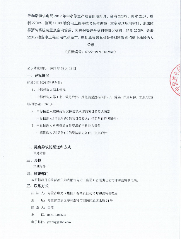 呼和浩特供電局2019年中小修生產項目照明燈具、金海220KV、秀水220K、勝利220KV、恰西110KV輸變電工程平抗吸音體設施、主變室泄壓牆材料、泡沫噴霧消防係統裝置及室內管道、火災報警設備材料等防火材料、沙良220KV、金海220KV輸變電工程起吊電動葫蘆、電動單梁起重機設備材料采購招標中標候選人公示