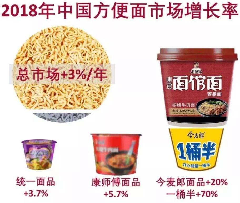 根據裏斯谘詢的統計,2017-2018年,今麥郎增速同比增長20%,而同一時期的康師傅增速為5.7%,統一為3.7%。2018年今麥郎方便麵業務突破70億,僅僅排在康師傅和統一之後,成為了中國方便麵市場前三甲之一。