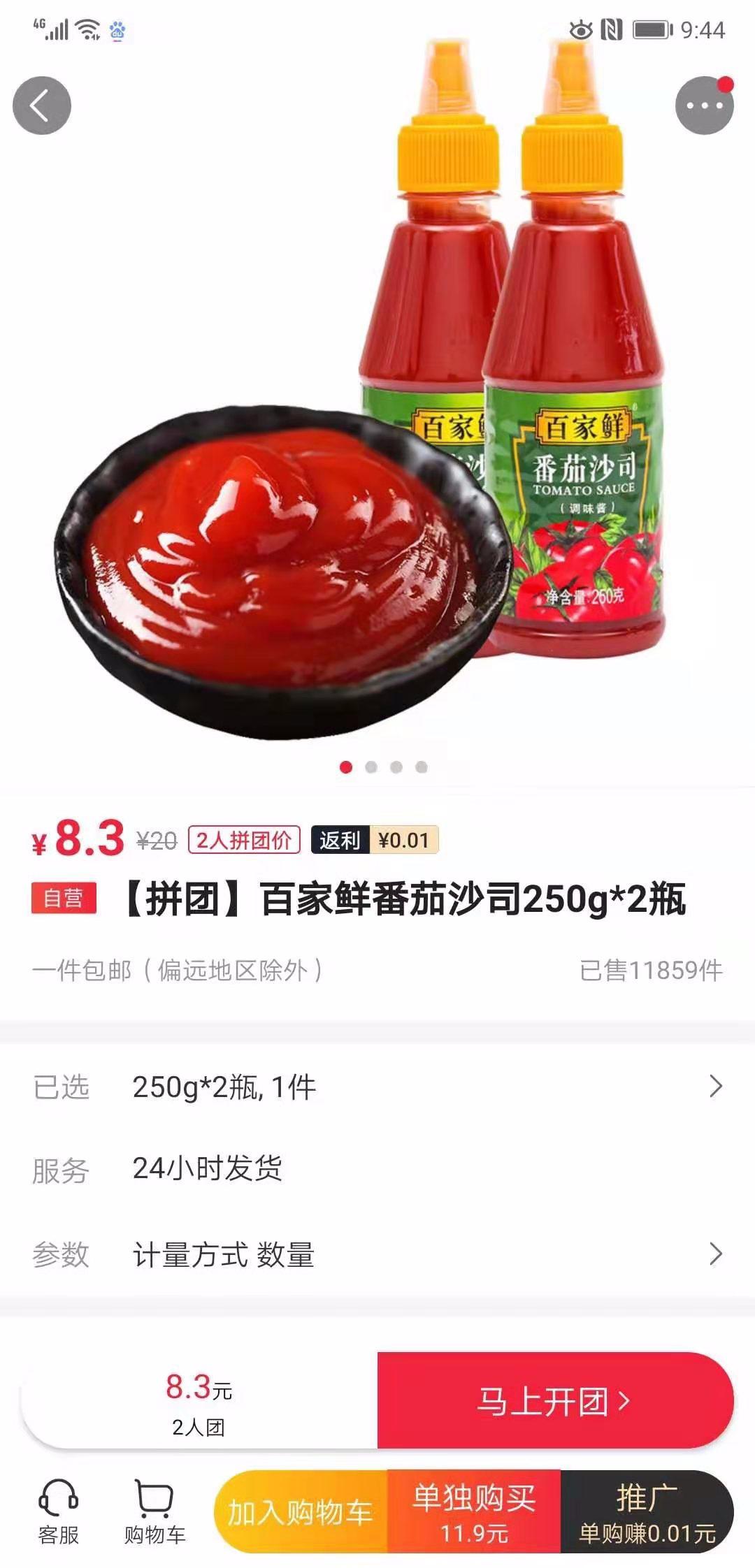 同樣在每日一淘平台上推出的拚團價為8.3元2瓶的百家鮮番茄沙司,月銷售突破1萬筆。