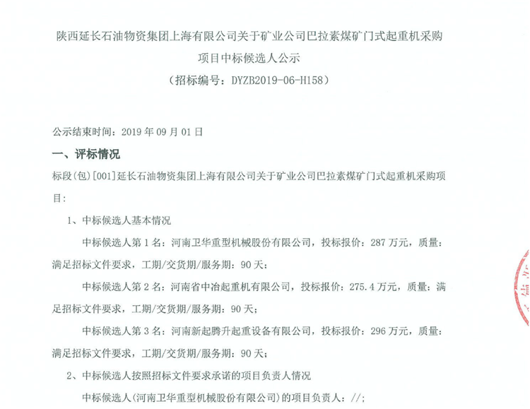 移動版:陝西延長石油物資集團上海有限公司關於礦業公司巴拉素煤礦門式起重機采購項目中標候選人公示