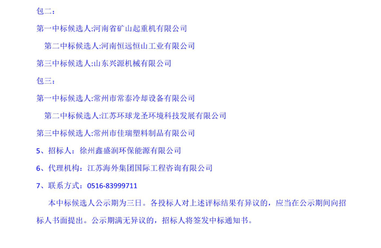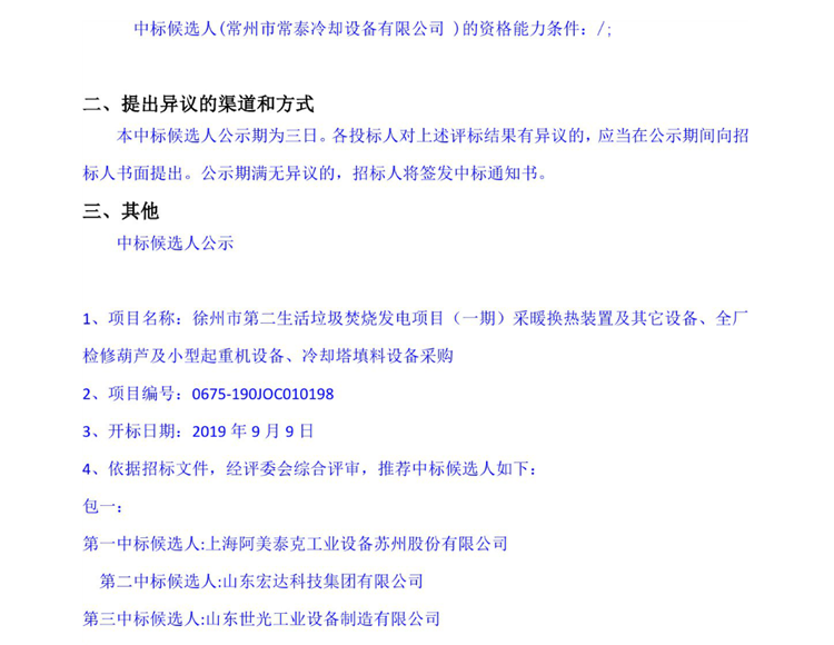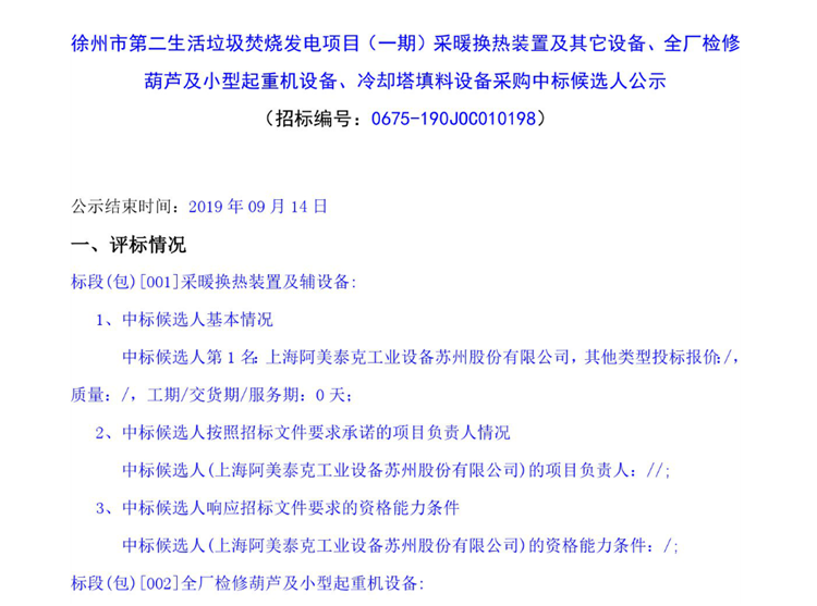 移動版:徐州市第二生活垃圾焚燒發電項目(一期)采暖換熱裝置及其它設備、全廠檢修葫蘆及小型起重機設備、冷卻塔填料設備采購中標候選人公示