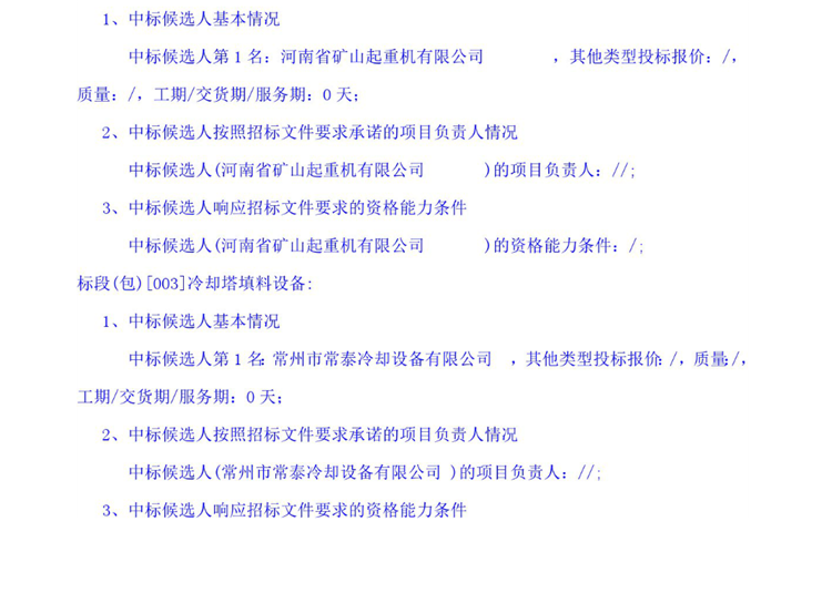 徐州市第二生活垃圾焚燒發電項目(一期)采暖換熱裝置及其它設備、全廠檢修葫蘆及小型起重機設備、冷卻塔填料設備采購中標候選人公示