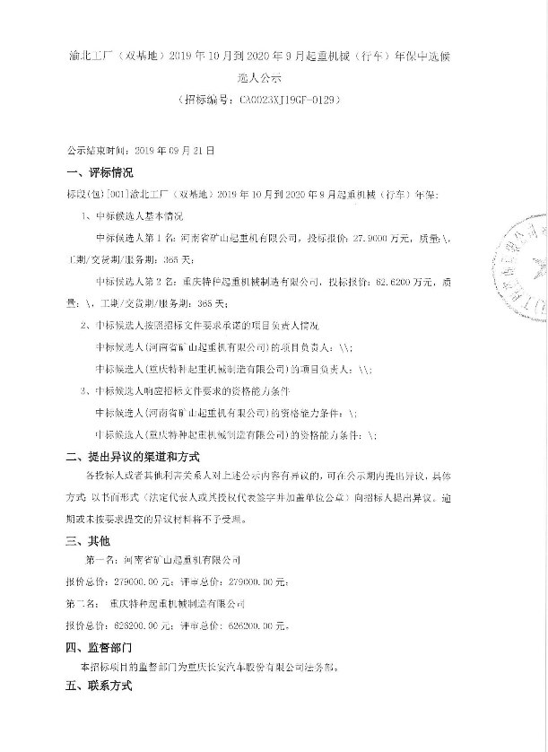 渝北工廠(雙基地)2019年10月到2020年9月起重機械(行車)年保中選候選人公示