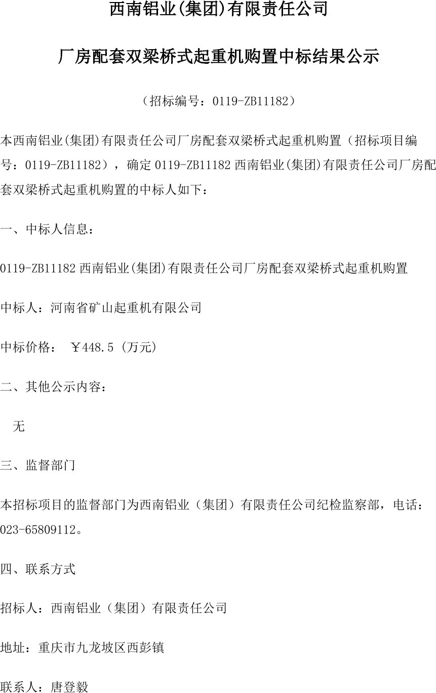 移動版:廠房配套雙梁橋式起重機購置中標公示