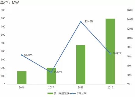 圖2:2016-2019年中國已投運光伏儲項目的累計裝機規模