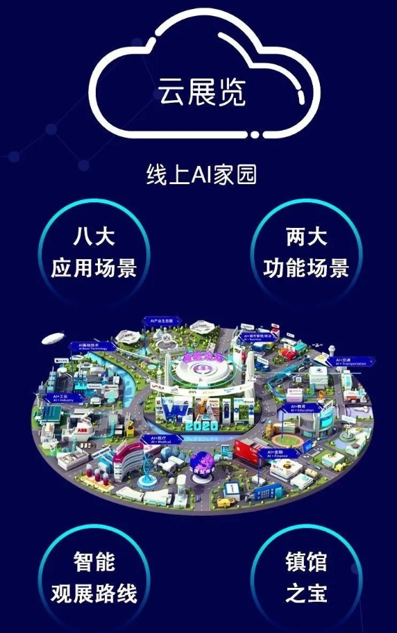 據悉,“3D虛擬AI家園”以上海為藍本,依托3D動態展示、在線雲會議、雲商洽等技術形式,將傳統線下展覽轉變為線上數字體驗。線上AI家園圍繞重點企業特設“AI先導區”,涵蓋AI+教育、AI+醫療、AI+交通、AI+金融、AI+工業、AI+基礎技術、AI+城市管理與商業共七大場景,打造智能雲平台,展現AI產業生態圈。