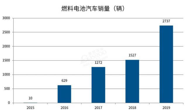 從 2019 年銷量來看,我國燃料電池汽車銷量增速明顯,全年銷售 2737 輛。從 2015 年僅有的 10 輛到 2019 年底,我國燃料電池汽車累計銷量超過 6500 輛,已達成“實現 5000 輛氫燃料電池汽車規模”的階段性目標。