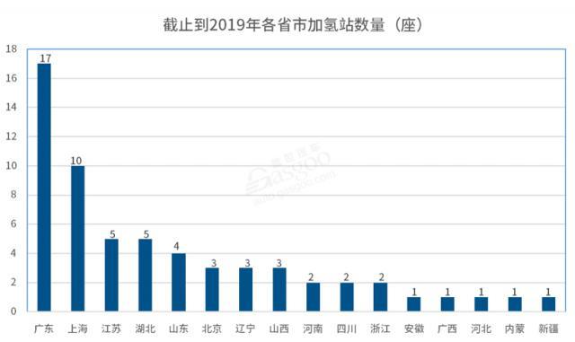 分地區來看,截止到 2019 年底,全國已經有 16 個省市建成了加氫站,分布比較散。61 座加氫站主要分布在廣東(以佛山為主)、上海、江蘇等地,其他地區數量較少。