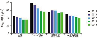 2013年以來,中國在經濟持續增長、能源消費量持續增加的情況下,環境空氣質量總體改善。2019年,全國PM2.5平均濃度較2015年下降了20%。重點區域PM2.5濃度和重汙染天數大幅減少,以京津冀及周邊地區“2+26”城市為例,2019年PM2.5濃度較2015年下降28%,重汙染天數減少45%,以PM2.5為首要汙染物的天數下降了44%;北京市PM2.5濃度由81微克/立方米下降到42微克/立方米,重汙染天數由43天下降至4天。