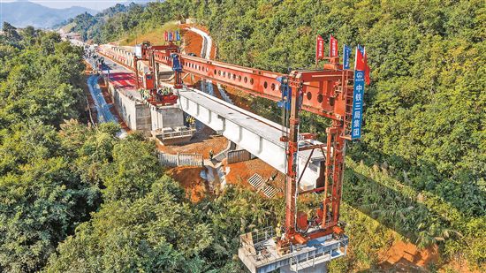 12月1日,在位於芒市的戶育2號大橋施工現場,隨著施工人員將首片T梁精準吊裝安放在橋墩上,大(理)瑞(麗)鐵路保山至瑞麗段開始架梁施工,標誌著大瑞鐵路架梁工程全麵鋪開。