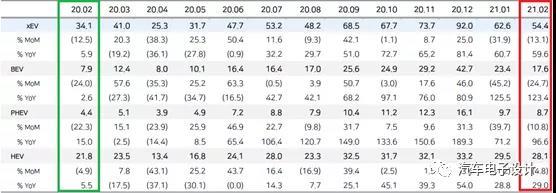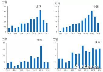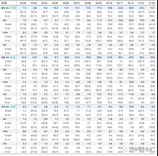 備注:SNE對全球BEV的量也做了分解,2月全球純電動汽車(BEV)的銷量為17.6萬輛(同比增長123%),其中歐洲48,000輛(同比+ 15%),中國88,000輛(同比+ 759%),美國為31,000台(同比增長102%)