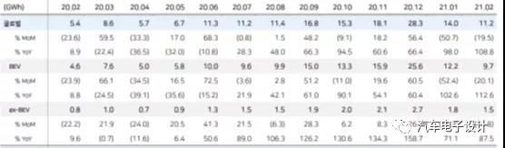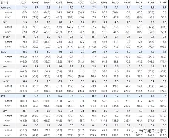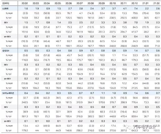 SNE對於全球動力電池的數據做了一些發布,我這邊通過韓文的證券公司報告做了一些整理。2021年前兩月,全球動力電池裝機量為25.2 GWh,同比增長一倍以上。其中2月份裝機量為11.2GWh。