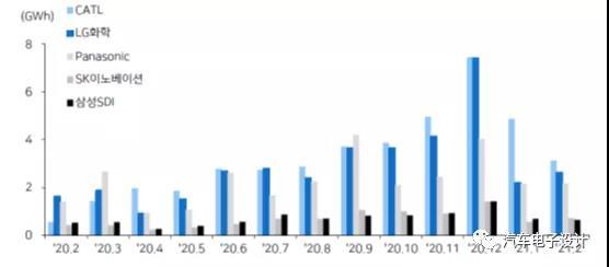 全球排名前五的企業的數據圖,我也摘錄出來了,CATL、LG、鬆下、SK和SDI2月份的裝機量分別為3.1GWh、2.6GWh、2.2GWh、0.7GWh和0.6GWh。