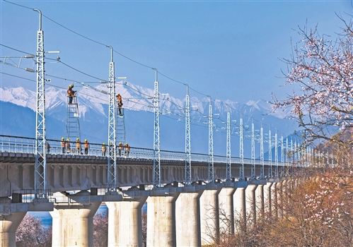 3月30日,西藏自治區林芝市,中國中鐵電氣化局集團的技術人員正在對接觸網進行精調。