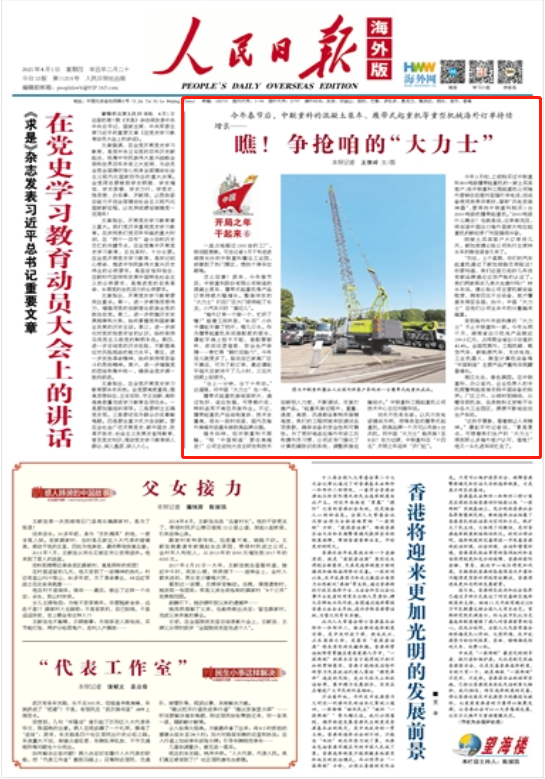4月1日,《人民日報》(海外版)頭版發表了《瞧!爭搶咱的“大力士”(開局之年幹起來)》文章。人民日報記者以走進中聯重科麓穀工業園的一線見聞,呈現了公司生產、銷售的繁忙圖景;講述了履帶起重機高端市場從最初被歐美品牌占據,到如今以中聯重科為代表的中國製造“大力士”熱銷海內外。文章聚焦中聯重科,向海內外讀者生動地展現了中國裝備製造的技術實力以及市場活力,也展示了“十四五”開局之年中國裝備製造企業的新氣象、新風貌。