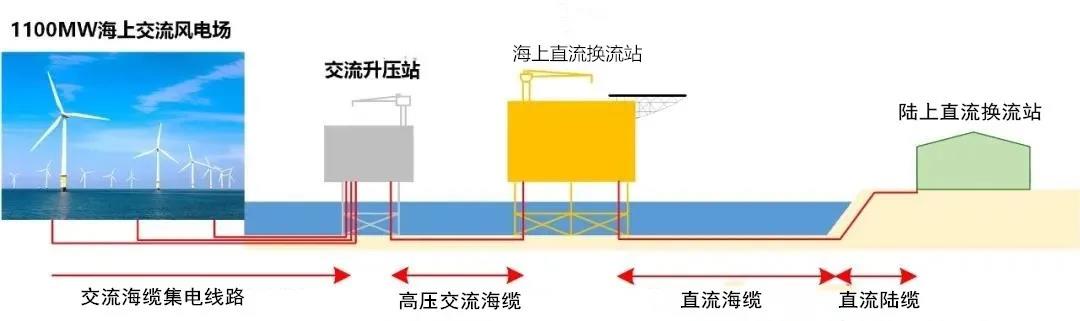 工程接線示意圖如上圖所示,其中海上換流站負責彙聚如東H6、H8、H10三個海上風電場共1100兆瓦電能,通過直流海底電纜將電能輸送至陸上換流站;陸上換流站通過1回500千伏交流線路接入江蘇電網。