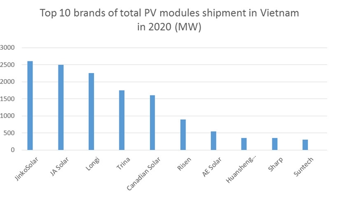 越南MOIT與Clean Energy Associate官方媒體Vietnam Energy Online近日發布2020年越南組件出貨量市場報告,數據統計顯示,晶科能源以超過2.5GW的銷量,連續第三年穩居越南市占第一。晶澳,隆基分列第二、第三,阿特斯,東方日升,新源,東方環晟,夏普,尚德緊隨其後。