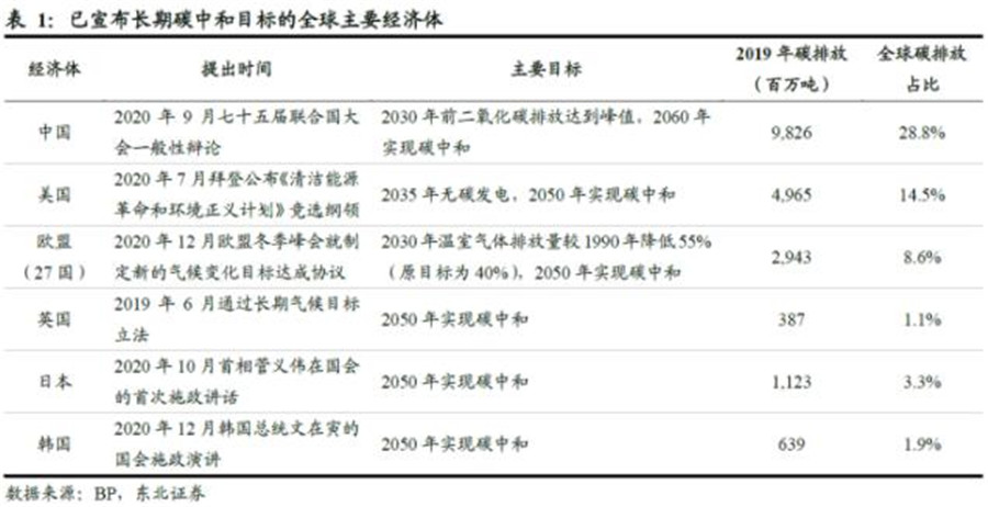 並且2020年下半年以來,全球主要經濟體陸續提出長期“碳中和”目標,當下減排已成全球共識。