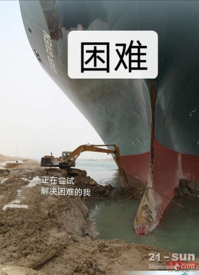 為了解救擱淺的“長賜號”,蘇伊士運河管理局派出一輛挖掘機(後又派出多輛挖掘機),疏通船身周圍的沙石。