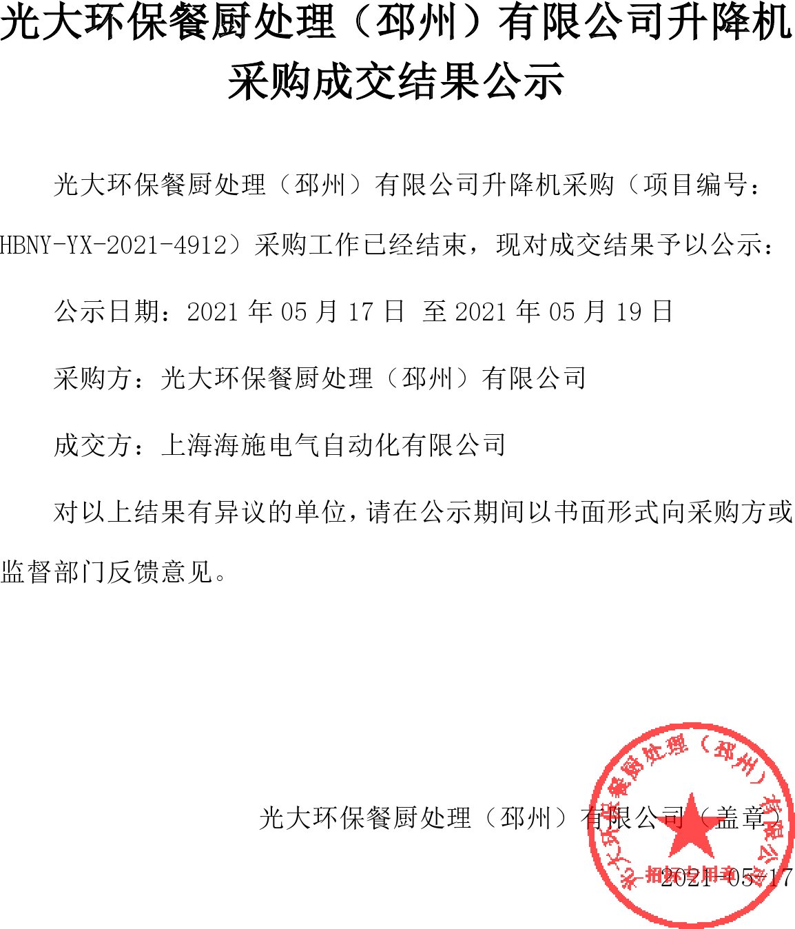 移動版:江蘇“”:光大環保餐廚處理(邳州)有限公司升降機采購成交結果公示