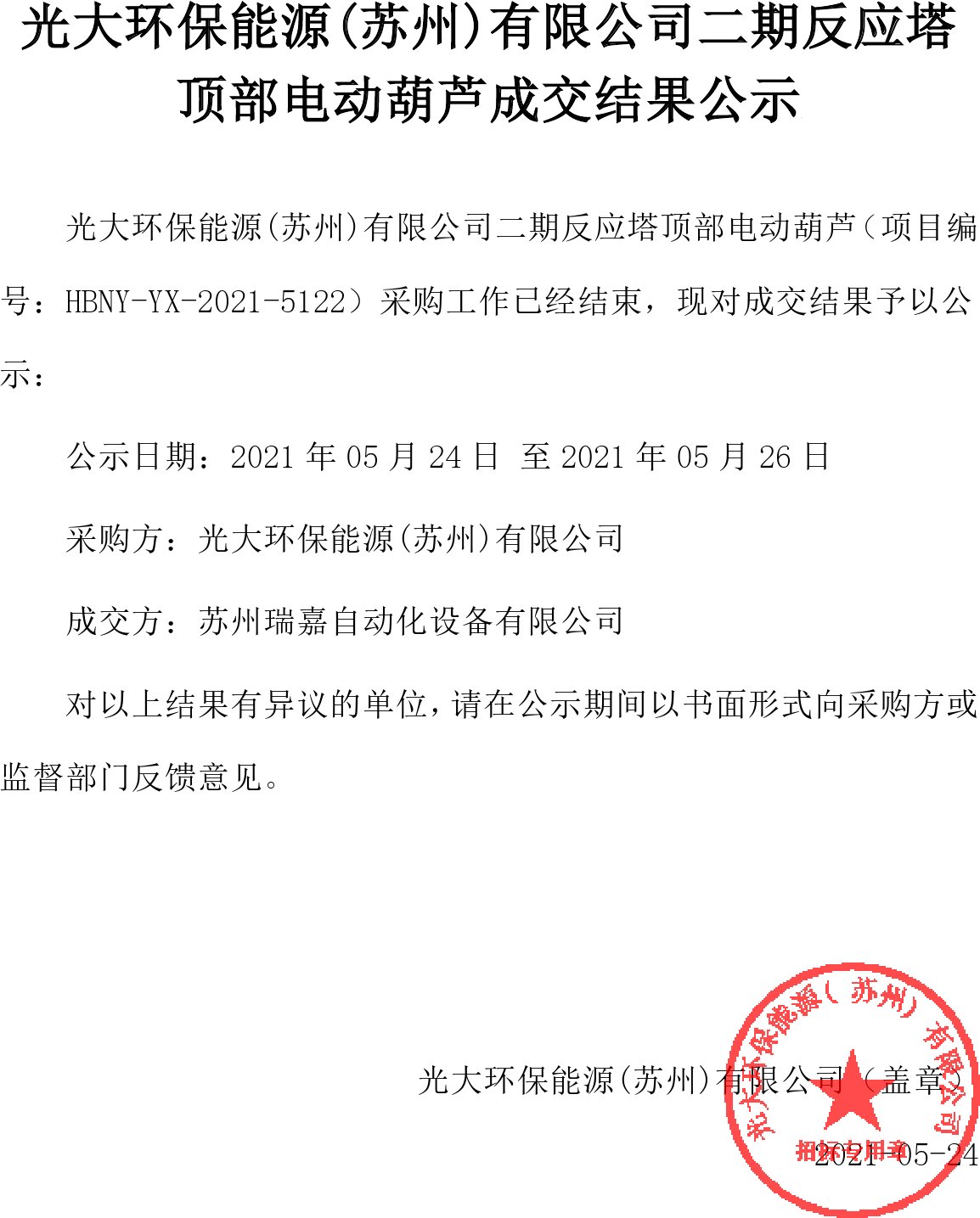 移動版:江蘇:二期反應塔頂部電動葫蘆成交結果公示