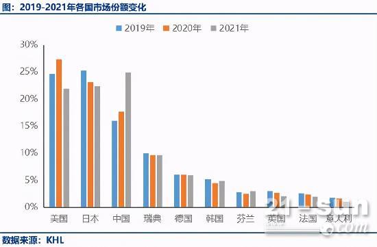 榜單顯示,2021年全球各國工程機械行業市場份額排名前三的國家分別是中國、日本、美國,分別為24.9%、22.4%、21.9%。