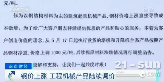 根據各家企業發布的產品調價通知函,中聯重科、徐工機械分別自5月17日、6月1日起,執行發貨的塔機和升降機全係列產品按照產品鋼材淨重,價格上調1000元/噸。山東臨工裝載機價格按不同係統分別上調8000元/台到20000元/台。