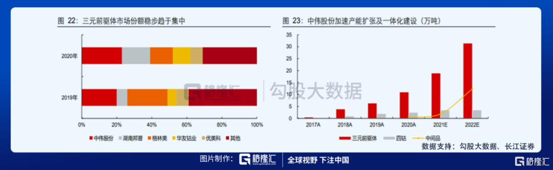 在三元正極前驅體幾家龍頭中,中偉緊密綁定大客戶,已與LG化學、廈門鎢業、當升科技、振華新材、天津巴莫、三星 SDI 等客戶建立了穩定的合作關係。2020 年公司前三大客戶(LG 化學、廈門鎢業、特斯拉-LG)合計銷售金額占比達到 73.3%,占比較高且持續提升,其中 2020 年上海特斯拉的三元前驅體為公司獨供。此外公司在往上遊延伸過程中,單噸盈利有擴張的趨勢,有望破千億。