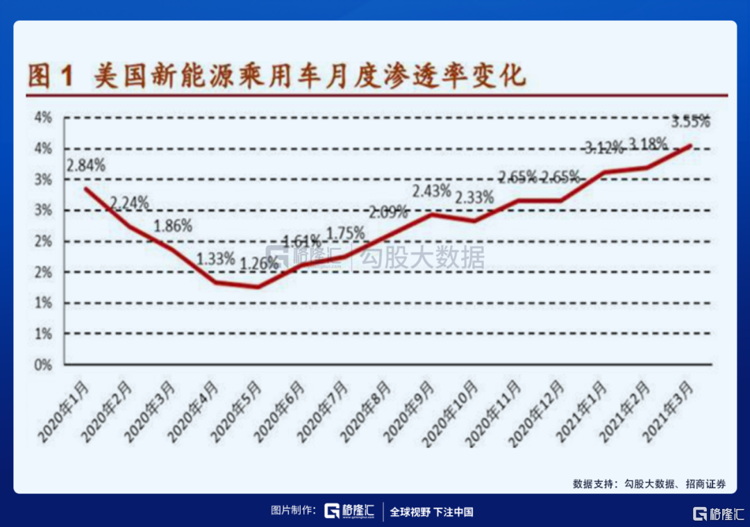 根據招商證券數據,當下美國新能源乘用車的月度滲透率還隻有3.55%,離50%的目標還有很大的上升空間,明年的美國電動車市場,類似於去年的歐洲,會帶動全球新一輪高增長。