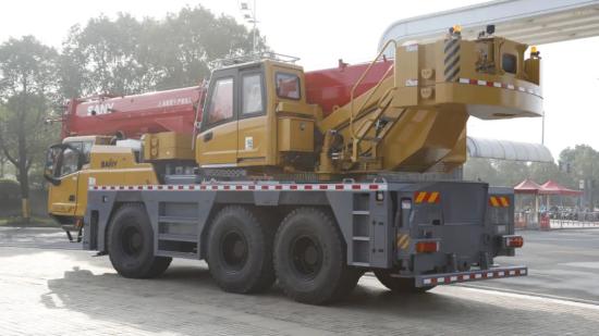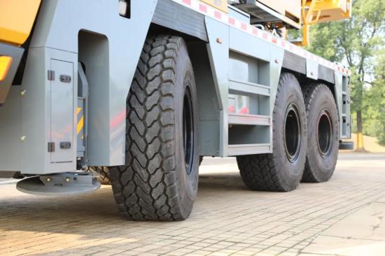 這款機型的越野才能非常強。德國原裝進口的Kessler重載車橋,三橋全橋驅動。搭配525輪胎,最大承載13.5t,承載力大幅提高。340匹超大馬力,50%的最大爬坡度。山地、沙漠這些汽車吊去不了的地方,它都能上。所以,它非常適用於500kV及以下的高壓線塔吊裝。