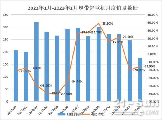 據我國工程機械工業協會對8家履帶起重機製作企業計算,2023年1月月當月出售各類履帶起重機175台,同比下降15.5%。