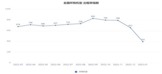 2023年1月高空作業平台出租率環比下降39.8%,同比下降23.8%。因為2022年春節假期在2月初,所以2023年1月份數據與2022年2月份相比根本持平。受假期影響所有機型出租率都呈現不同程度的下滑。(出租率是以台天數為基準進行核算,100%出租率對應1000點。)