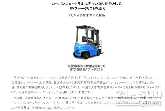 比亞迪於2015年開始在日本出售鋰電池叉車,到目前為止,已經向物流、機械、製作業以及食品行業等交付了約500台(統計至2023年3月1日)叉車。運用用戶有日立、NTT、三得利啤酒等知名企業。日本比亞迪叉車公司將繼續支持日立GLS完成碳中和,在日本推廣環保電動叉車,為日本政府完成碳中和社會盡力作出貢獻。