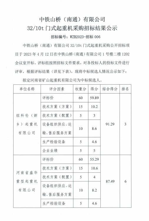中鐵山橋(南通)有限公司32/10t門式起重機采購招標結果公示