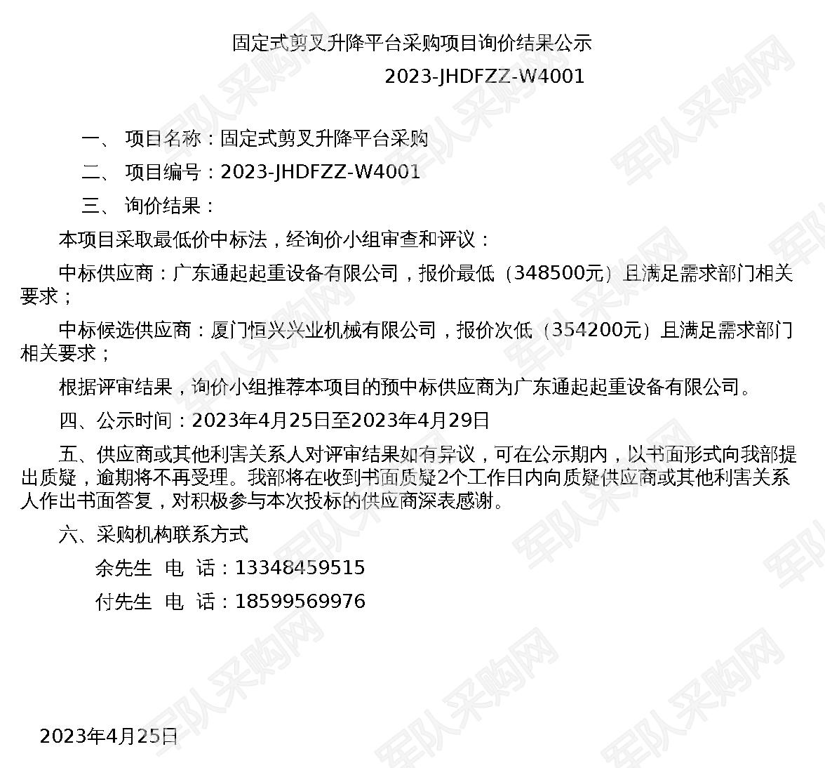 移動版:固定式剪叉升降平台采購項目詢價結果公示