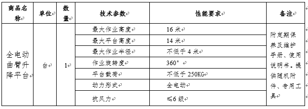 采購全電動曲臂升降平台1台(提供隨機附件、專用工具)。