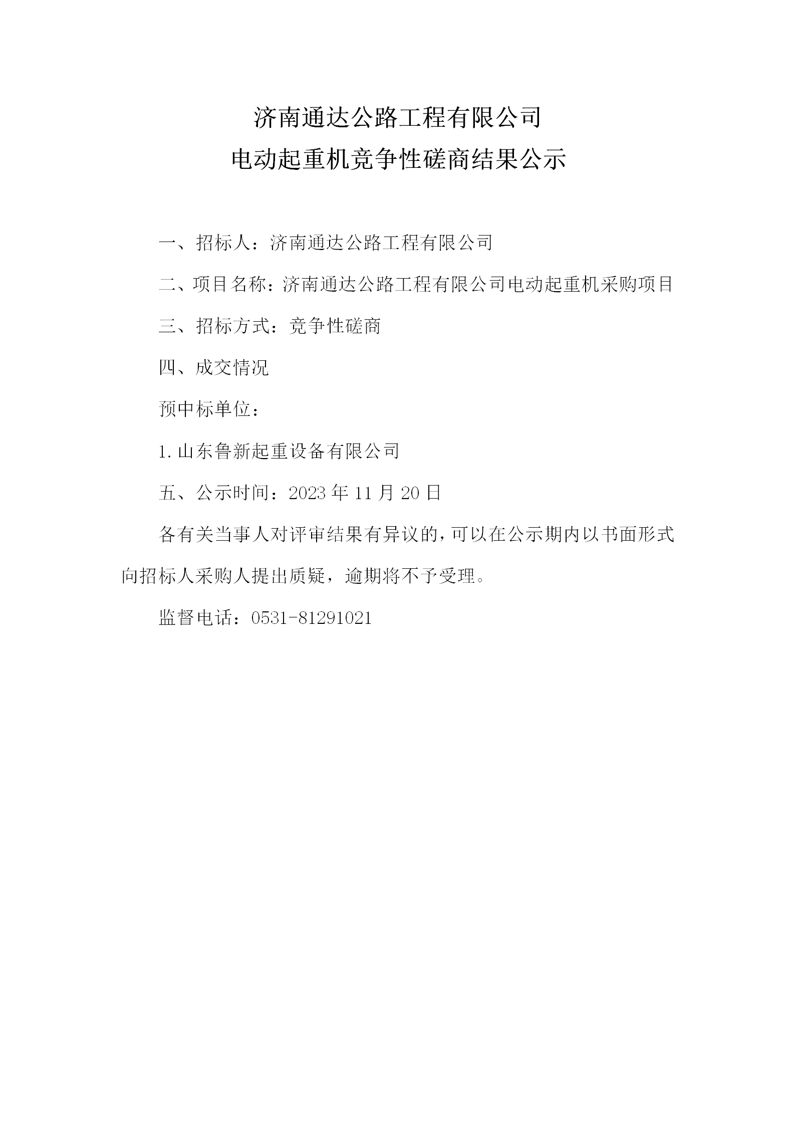 濟南通達公路工程有限公司 電動起重機競爭性磋商結果公示
