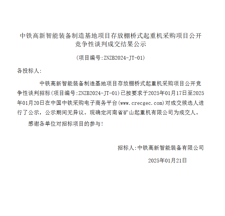 移動版:中鐵高新智能裝備製造基地項目存放棚橋式起重機采購項目公開競爭性談判成交結果公示
