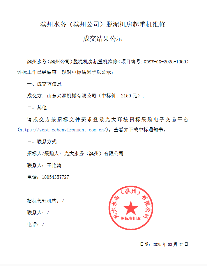 移動版:濱州水務(濱州公司)脫泥機房起重機維修成交結果公示