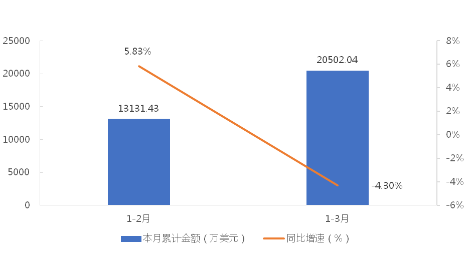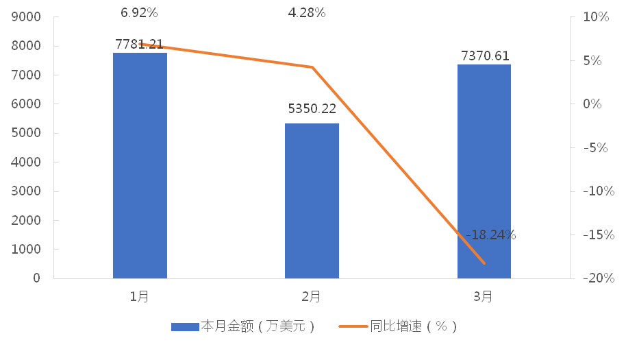 1-3月,我國履帶式起重機累計出口金額為20502.04萬美元,同比下降4.30%;累計出口數量為933台,同比下降85.64%;出口均價為21.97萬美元/台,同比增長565.76%。